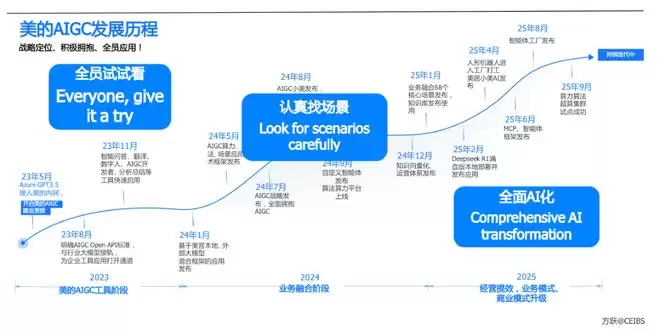 重新构想:必须摆脱“人+工具”的旧思维框架。着眼增长:AI带来的不仅仅是降本增效,更是“无限劳动力”和打破组织边界带来的新增长模式。互联网打破了企业间的边界,而AI将真正打破企业内部的边界。保持紧迫性:观望的时间比互联网时代更短,必须立即行动。案例分析:美的集团的AIGC转型之路
