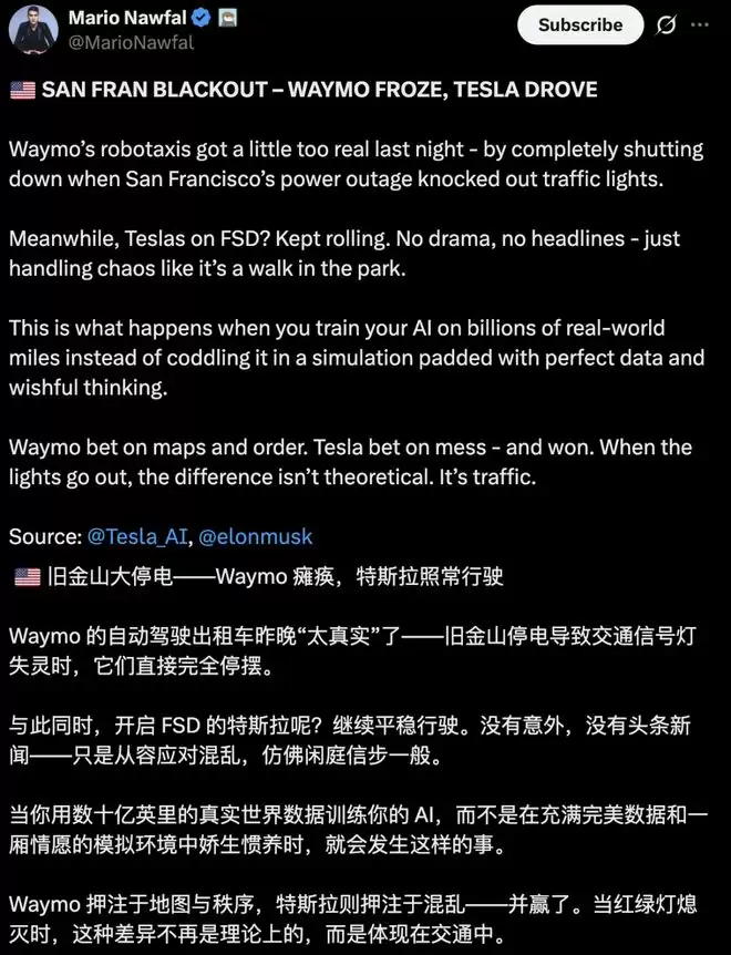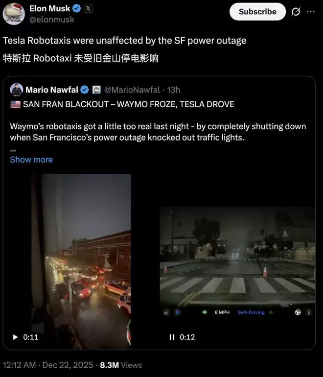 马斯克转发了X平台关于旧金山停电带来的混乱场面,还轻描淡写地补了一刀:特斯拉的Robotaxi,在这次停电中「完全未受影响」。