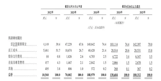 而如果只看和训练相关的云计算服务开支,我们可以发现尽管2025年前三季度的训练成本高达1.42亿美元,是2024年4722万美元的接近三倍,但是其占收入的比例,已从2024年的超过1365%,优化到今年前9个月的266.5%。