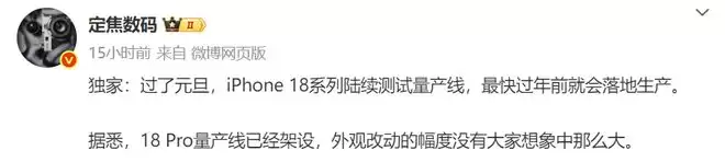关键博主还称iPhone18 Pro量产线已经架设,外观改动的幅度没有大家想象中那么大,从这点可以看出节奏有多么的夸张。