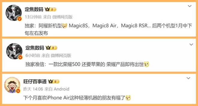 而荣耀Magic8 Air版本目前还是一个未知数,此前的市场中并没有特别多关于这款新机的爆料信息。