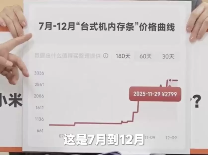 卢伟冰判断,2025年至2027年间都将是内存成本持续上涨的年份。直播中,他介绍了7月至12月台式机内存条的涨价情况,从1000元左右涨到了3000多元,价格涨幅接近三倍。