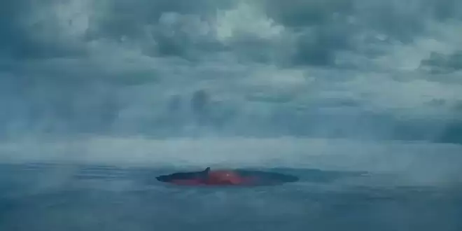 在画面色彩上也运用了对比和忽明忽暗的设计,有种虚虚实实的隐喻。像冰天雪地里红彤彤的苹果;穿着白色防护服的消杀人员,穿梭在黑暗的房间里,还配着大量的浓烟,灯光忽明忽暗;黑夜里,一边是遍地的鲜血,一边是祭奠亡魂烧纸钱的火光。