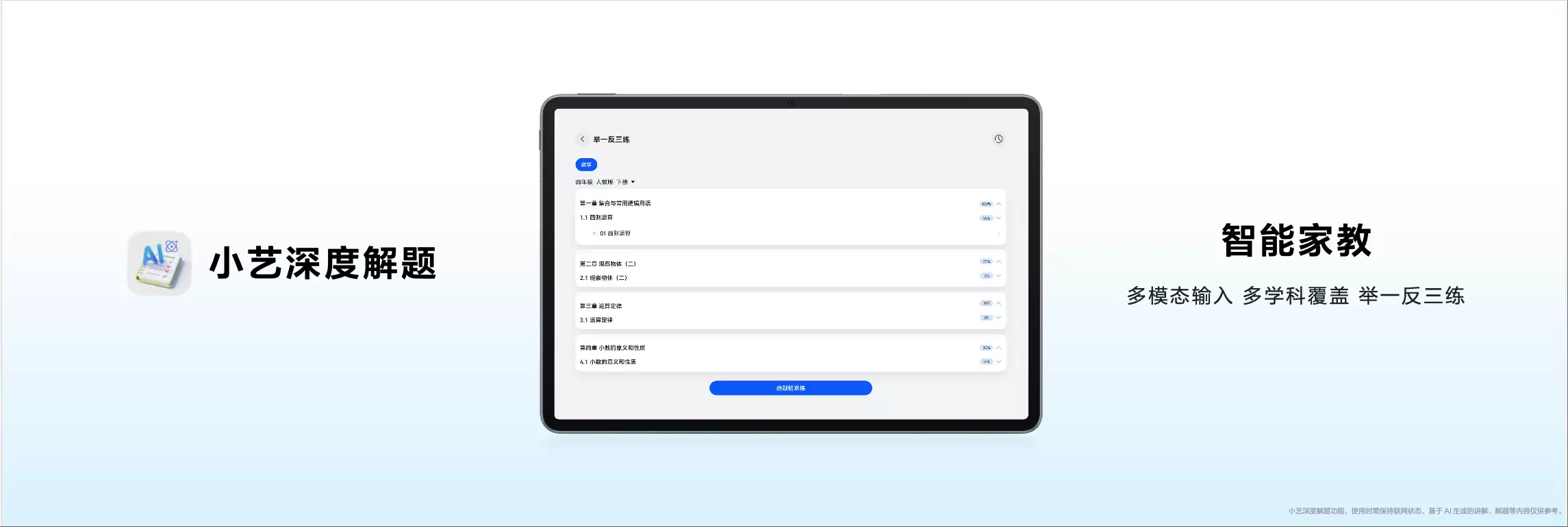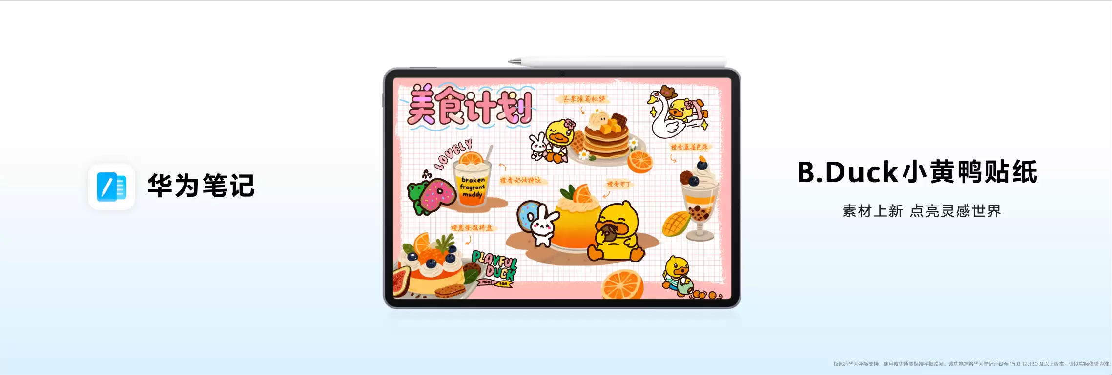 在智慧学习方面,华为MatePad 11.5深度融合HarmonyOS,带来全新升级的小艺深度答题功能。它支持拍照搜题,不仅提供清晰的步骤解析与多种解法,更能通过提问引导学生自主思考。该功能还可实现作业批改、AI互动讲解,并基于学习过程自动生成错题本,助力系统化查漏补缺与巩固提升。华为笔记也迎来重要升级。实时AI字迹调整功能可以自动美化笔迹,保持页面工整;无界笔记打破传统笔记边界,让思维导图、数学演算不受限制;圈选搜题功能则支持在笔记中一键唤起小艺获取解题思路,使疑问得以即时解答。此外,素材集市持续更新个性化资源,全新小黄鸭主题贴纸,为知识整理增添趣味。