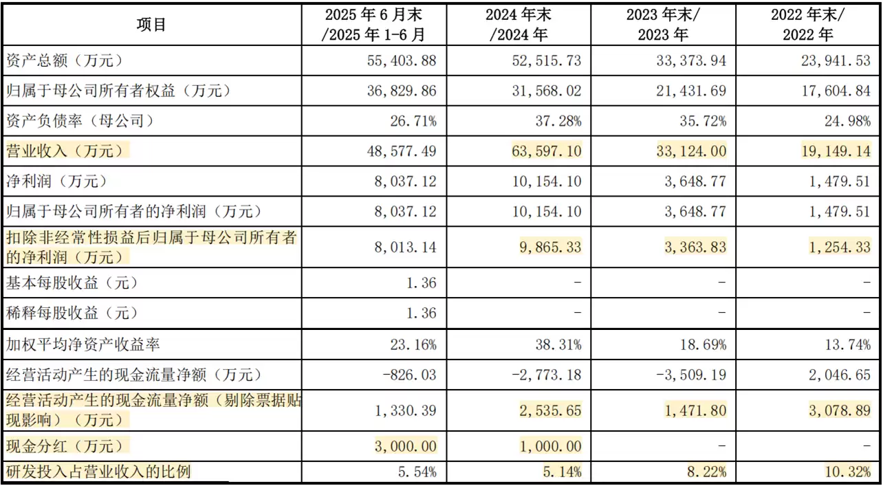 2022年至2024年,公司营业收入分别为1.91亿元、3.31亿元、6.40亿元及4.86亿元;同期,归属于母公司所有者的净利润分别为0.15亿元、0.36亿元、1.02亿元及0.80亿元。