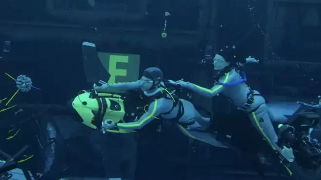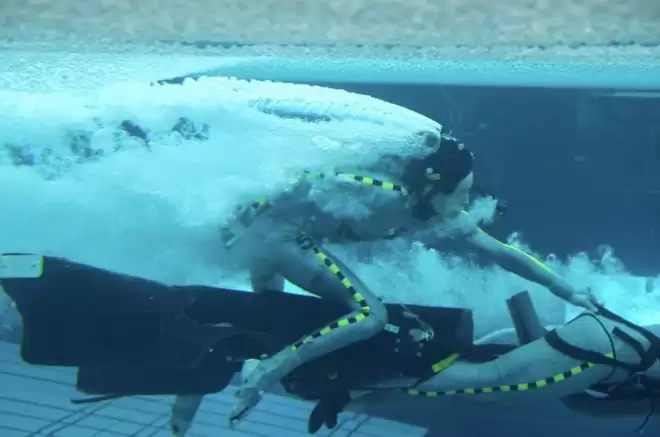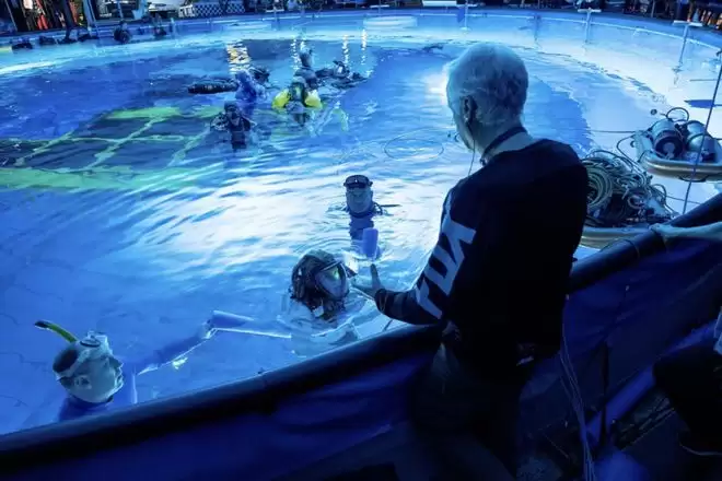 面对这一挑战,卡梅隆没有选择行业惯用的「干拍湿」技术,也就是让演员在空气中吊威亚、用风扇吹动头发、后期添加气泡和色差来假装水下场景,而是坚持必须「湿拍湿」,也就是在真实水体中完成动作捕捉和表演。