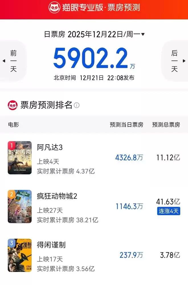 科幻巨制《阿凡达:火与烬》(简称“《阿凡达3》”)由国际知名导演詹姆斯·卡梅隆执导,12月19日在中国内地与北美同步公映,片长198分钟。据猫眼专业版数据,截至12月22日19时,《阿凡达3》累计票房4.37亿元。猫眼最新票房预测数据显示,该片的预测总票房达11.12亿元。