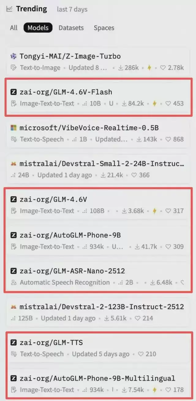 12 月的第二周,智谱连续五天开源 GLM 多模态和智能体系列模型,在 Hugging Face Trending 榜单前 10 名中,智谱占据 5 席之多。
