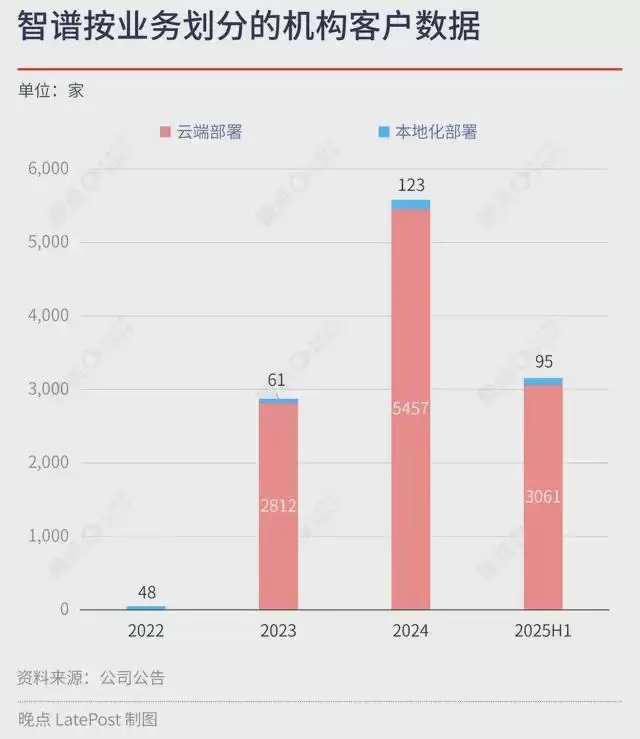 这带来的结果是,2025H1 智谱本地化和云端部署的机构客户分别为 95 家和 3061 家,而 2024 全年的机构客户则分别为 123 家和 5457 家,MaaS 平台业务的降价不仅增加了云端机构客户的数量,同时还对本地化部署业务起到了引流的明显效果;