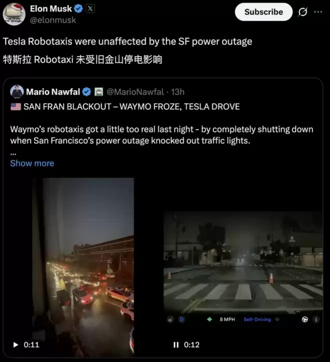 旧金山停电引发Waymo混乱,特斯拉自动驾驶应对更胜一筹