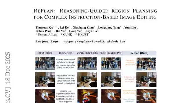 腾讯AI实验室的研究团队发现了这个问题的根源,并提出了一个叫做RePlan的创新解决方案。他们把这类挑战称为"指令-视觉复杂度",就像是给一个刚学会识字的孩子一本复杂的地图,然后要求他找到特定的小巷并只在那里做改动一样困难。