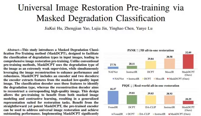A:MaskDCPT是北京大学团队提出的一种新的图像修复预训练方法。传统方法通常需要针对每种图像问题(如去雨、去雾)单独训练一个模型,而MaskDCPT通过让模型同时学习识别问题类型和修复问题,训练出一个能处理多种问题的通用模型。它的核心创新是发现了问题识别和图像修复这两个任务是互相促进的。
