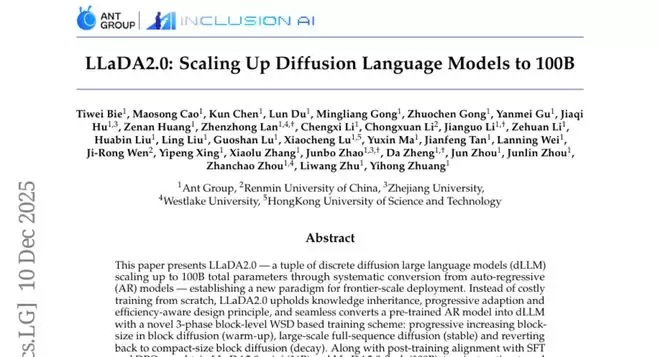 这项由蚂蚁集团联合人民大学、浙江大学、西湖大学和香港科技大学的国际研究团队于2025年12月发表在arXiv预印本平台上的研究(论文编号:2512.15745v1),成功开发出了名为LLaDA2.0的全新AI语言模型系列。这个系列的"旗舰"版本LLaDA2.0-flash拥有惊人的1000亿参数规模,在AI语言生成领域开创了一个全新的技术路径。