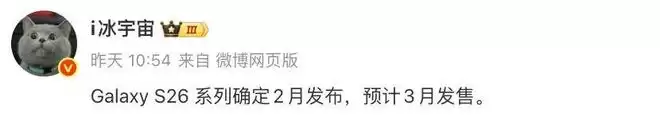 博主@i冰宇宙 近日的一份消息显示,“Galaxy S26 系列确定2月发布,预计3月发售。”