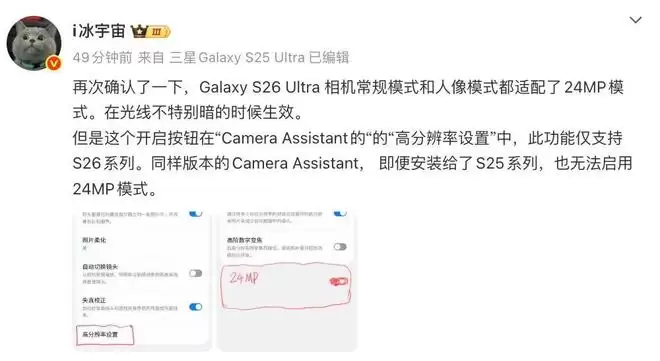 但是这个开启按钮在“Camera Assistant的“的“高分辨率设置”中,此功能仅支持S26系列。同样版本的Camera Assistant, 即便安装给了S25系列,也无法启用24MP模式。