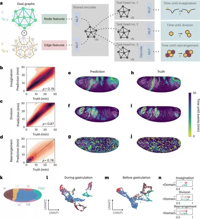 来自 MIT 团队的一项研究有望改变这一局面。近期,他们在《自然·方法》(Nature Methods)期刊发表了一项名为 MultiCell 的几何深度学习方法,首次实现了在单细胞分辨率下,逐分钟预测果蝇胚胎发育过程中每一个细胞的行为变化。这项工作由 MIT 机械工程系副教授郭明(Ming Guo)、博士生 Haiqian Yang 以及来自密歇根大学和东北大学的合作者共同完成。