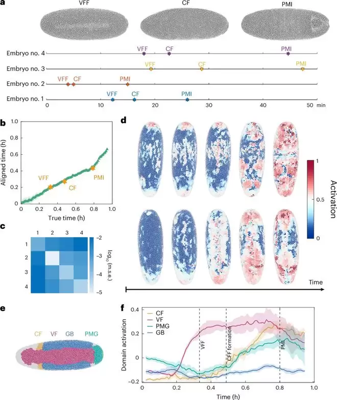 这套流程被应用于果蝇早期胚胎发育中最关键的阶段之一:原肠胚形成(gastrulation)。在这个大约持续一小时的窗口里,原本表面光滑的椭球形胚胎会经历剧烈的形态变化,细胞在分钟级别的时间尺度上不断重排。腹沟(ventral furrow)、头沟(cephalic furrow)、后中肠内陷(posterior midgut invagination)等关键结构相继出现。