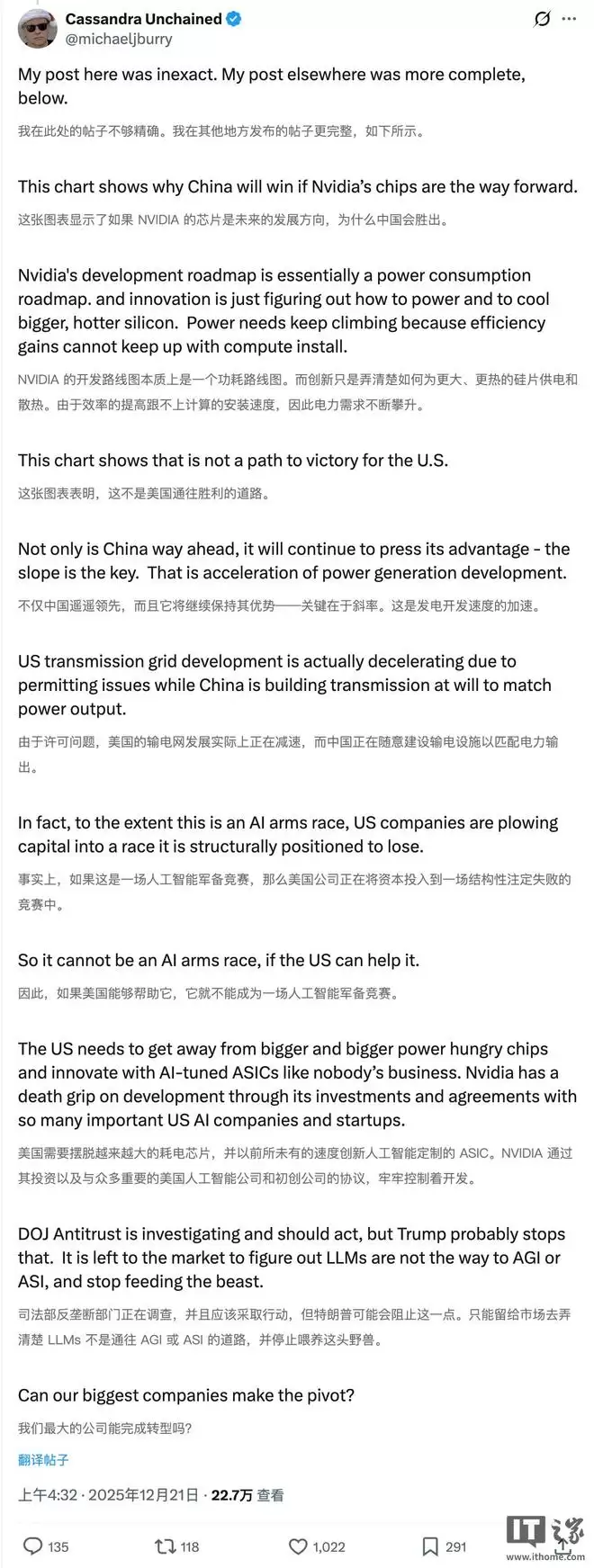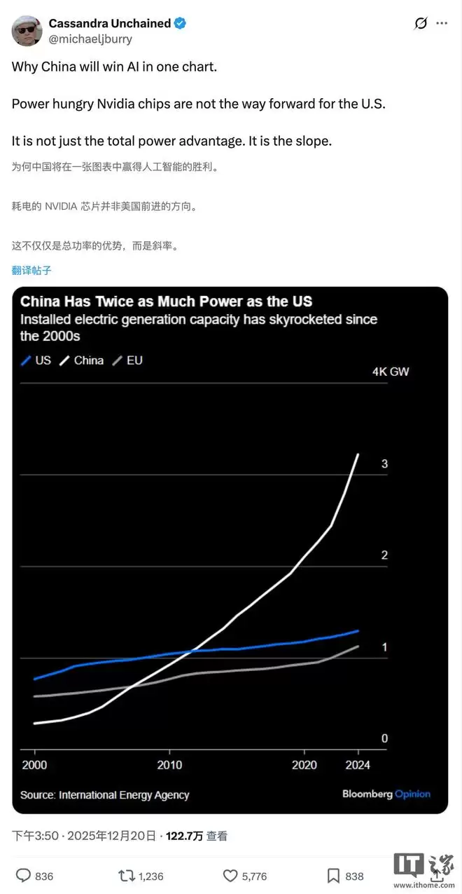 IT之家 12 月 22 日消息,据《商业内幕》今晚报道,迈克尔・伯里认为,英伟达正不断强化一种叙事:只有制造功耗越来越高的 GPU,才能推进 AI 进步。然而,这条路径可能会让美国在与中国的 AI