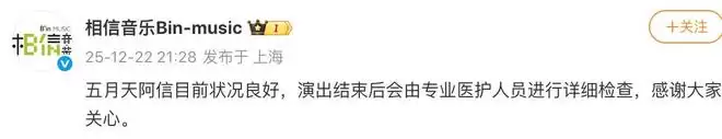 演唱会进行中,相信音乐就通过社交平台发声,替阿信报了平安。阿信方也在第一时间向网友们讲述了事情经过,并说明演唱会一结束,就会有专业医护人员为他进行详细检查。