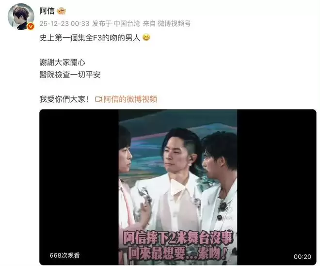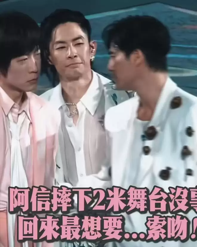 此外,阿信还在网上分享了演唱会现场的几个片段。画面中,他向F3成员索吻的亲密互动瞬间点燃了网络,粉丝们在兴奋不已的同时,也为他身体无恙的消息感到由衷的高兴。