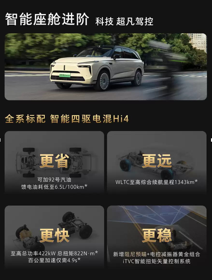 座舱空间设计凸显“全员平等”理念。新车采用2+2+2六座布局,打破传统主副驾与后排的配置差异:全车配备零重力座椅、可调节腿托,第三排空间经过优化后甚至能舒适容纳成年人体型。7L车载冰箱支持-6℃至50℃宽温域调节,搭配23扬声器7.1.4全景声音响与17.3英寸后排娱乐屏,打造出移动的“家庭影院”。智能座舱系统升级至Coffee OS 3.4,新增AI主动服务与晕动舒缓显示功能,进一步降低长途出行的疲劳感。