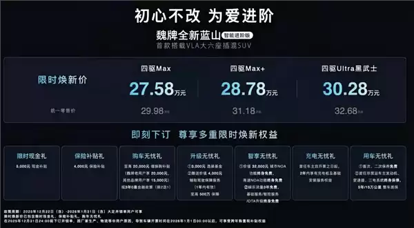 近日,长城汽车旗下魏牌全新蓝山智能进阶版正式登场。作为首款搭载VLA大模型的大六座插混SUV,新车共推出三个配置版本,官方指导价区间为29.98万元至32.68万元;在限时优惠后,售价进一步下探至27.58万元至30.28万元。此次升级着重提升了智能驾驶与座舱体验,同时延续了现款车型的空间优势与动力性能。