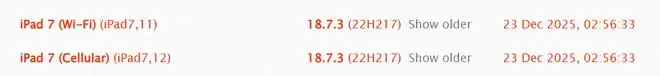 与此同时,苹果还进一步推送了iOS / iPadOS 18.7.3修正版,其版本号为22H217。本次推送的固件版本,虽然与苹果12月12日发布的版本号相同,但进一步适配了特定的硬件型号。