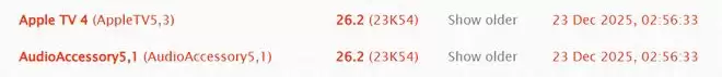 此次,苹果面向第四代Apple TV(硬件标识符为AppleTV5,3),发布了基于tvOS 26.2的固件版本更新,其版本号标记为“iOS 26.2”,具体构建号为23K54。