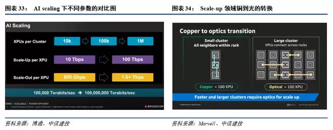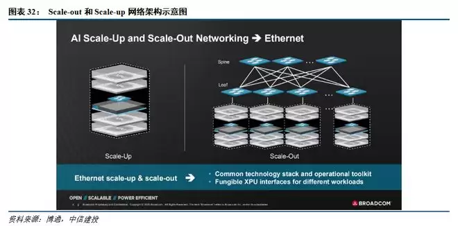 从行业内目前的XPU产品来看,Scale-up带宽显著大于Scale-out。从NV的GPU和各家的ASIC技术参数对比来看,XPU的平均Scale-up带宽为10Tbps,Scale-out带宽为800Gbps,Scale-up对Scale-out的带宽比例为12.5。根据博通CEO Hock的访谈记录来看,公司认为Scale-up的市场空间是Scale-out的5~10倍。中信建投证券认为,这里指代的是网络硬件,包括交换机、光模块、铜缆和PCB等。因此,网络板块各子领域都有望受益。
