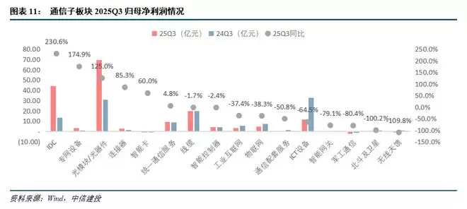 2025Q3,归母净利润同比表现突出的板块:IDC(44.3亿元,同比增长231%,与润泽科技非经常较大有关)、专网设备(3.3亿元,同比增长175%)、光模块/光器件(69.5亿元,同比增长125%)。2025Q3归母净利润同比增速后三位依次是:无线天馈(-0.04亿元,同比下降110%)、北斗及卫星(-0.002亿元,同比下降100%)、军工通信(-2.0亿元,同比下降80%)。部分领域增速较高主要与基数有关,建议同时关注营收与利润绝对值。