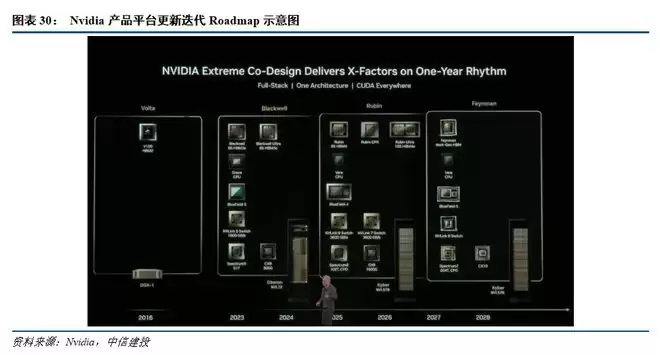 从英伟达GPU的Roadmap来看,公司的各项产品升级周期已压缩到了1年一代的节奏,同时速率和带宽不断提升。从2024-2024年公司推出Blackwell平台,配置1800GB/s的NVLink 5交换机,800G的CX8网卡以及51T的Spectrum5以太网交换机;到2025-2026年推出Rubin平台,配置3600GB/s的NVLink 6和NVLink7交换机,102T的Spectrum6 CPO交换机,以及1600Gbps的CX9网卡;再到2027-2028年的Feynman平台,配置NVLink8交换机,204T的Spectrum7 CPO交换机以及CX10网卡。