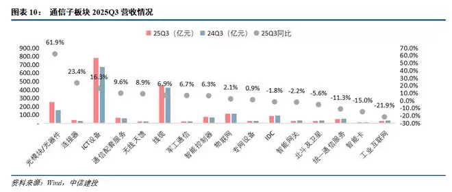 据中信建投通信团队对于通信行业各子板块的划分,通信各子板块中,2025Q1-Q3营收同比增速前三位依次是:光器件/光模块(662亿元,同比增长65%)、连接器(100亿元,同比增长19%)、ICT设备(2313亿元,同比增长15%),基本都因为AI带动。2025Q1-Q3营收同比增速后三位依次是:工业互联网(78亿元,同比下降26%)、智能卡(31亿元,同比下降21%)、智能网关(83亿元,同比下降12%)。