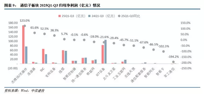 各子板块中,2025Q1-Q3归母净利润同比增速前三依次是:光器件/光模块(169.4亿元,同比增长123%)、连接器(8.2亿元,同比增长62%)、IDC(65.0亿元,同比增长52%,总体有转好迹象,也与润泽科技大额投资收益有关)。2025Q1-Q3归母净利润同比增速后三依次是:军工通信(-1.6亿元,同比下降194%)、智能卡(-0.02亿元,同比下降102%)、智能网关(0.4亿元,同比下降86%)。