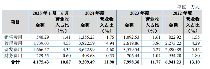 公司管理费用主要由职工薪酬、折旧及摊销、中介及咨询服务费、办公费等构成。报告期内,公司管理费用分别为2,273.22万元、2,619.86万元、3,822.59万元和1,739.03万元,管理费用率分别为4.29%、3.86%、4.94%和4.53%。2023年度,公司管理费用较2022年度有所增加。报告期内,公司管理费用率低于同行业可比上市公司平均水平。