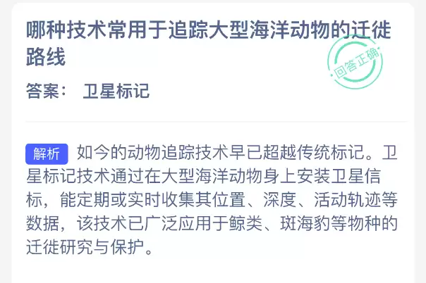 追踪大型海洋动物的迁徙路线,通常会用到哪种技术?【神奇海洋】12月22日的新题目已经可以作答!正确答案现已公布,点击领取拼图,一起为修复海洋生态贡献力量吧!今天的正确答案是:【卫星标记】。卫星标记技术是追踪大型海洋动物迁徙路线的常用手段。