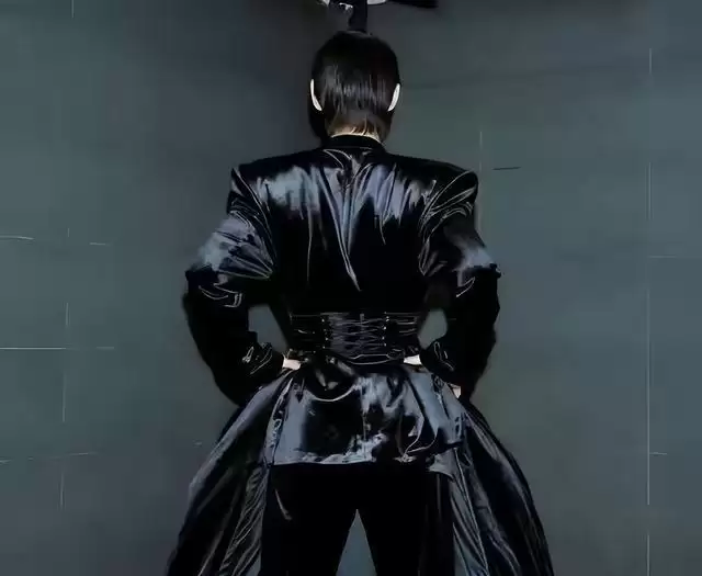 他也一点都没有改变过去的做法,直接就穿着黑色的连体“长裙”出现了。
