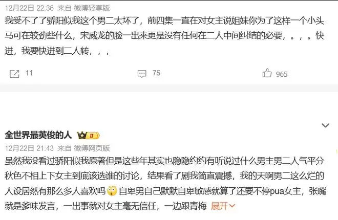还有的观众是直接怼庄序的颜值开炮,骂男二太丑,长得像小头儿子,还有说他脖子太长的。但更多的是被男二气到的,很多人说当男二放任聂曦光被误解跑出去的时候就已经出局了。