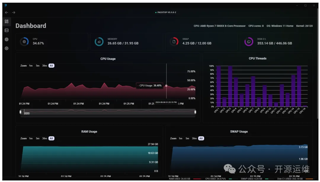 Pachtop 是一款基于 Rust 与 Tauri 框架构建的开源、跨平台系统监控应用,其设计目标是为用户提供比系统自带工具更详尽、界面更美观的实时性能数据展示,全面覆盖 CPU、内存、磁盘、网络及进程状态。