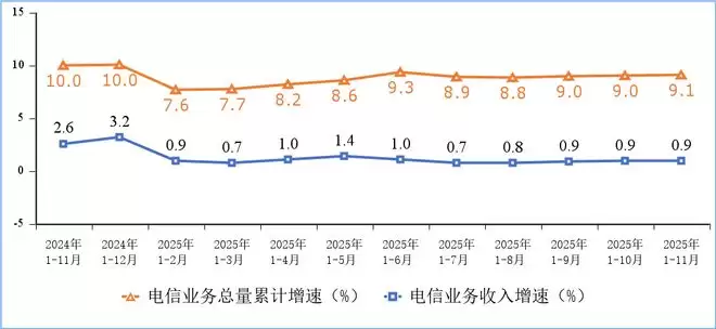 12月23日,IT之家获悉,工信部昨日公布了2025年前11个月通信业经济运行情况。数据显示,电信业务收入保持稳步增长,电信业务总量也小幅回升。前11个月,电信业务累计收入达16096亿元,同比增长0.9%。若按上年不变价计算,电信业务总量同比增长9.1%。