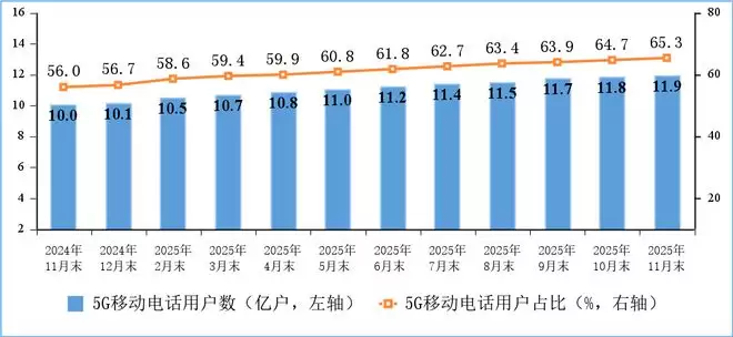 截至11月末,三家基础电信企业及中国广电的移动电话用户总数达18.28亿户,比上年末净增3854万户。其中,5G移动电话用户达11.93亿户,比上年末净增1.79亿户,占移动电话用户总数的65.3%。