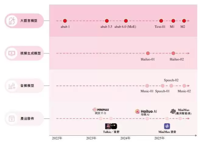 基于这一思路,MiniMax在近三年发布了多款基础模型,包括大语言模型M1和M2系列、文生视频模型Hailuo-02,以及语音生成模型Speech-02,这些模型为其多模态内容生成能力提供了技术基础。