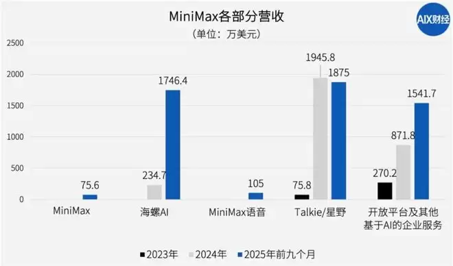 MiniMax的净亏损从2024年的7372.8万美元,激增266%至2024年的2.7亿美元,2024年进一步增至4.7亿美元。2025年前九个月亏损已达5.1亿美元,超过2024年全年。