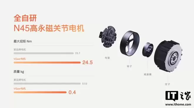“大头 BoBo”采用 1:1 的大小腿比例,搭载 12 个自研关节电机。该电机重量 0.4kg,扭矩达到 24.5N・m。