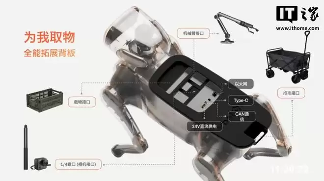 “大头 BoBo”还可搭载全能拓展背板(358 元),支持机械臂接口、尾部拖挂接口、1/4 螺口(相机接口)等。