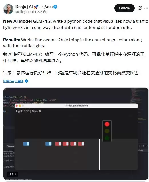在社交媒体上,网友Diego分享了使用GLM-4.7编写Python代码来可视化单行道红绿灯的案例,评价称结果“整体运行良好”,仅指出车辆颜色随红绿灯变化的细微瑕疵。