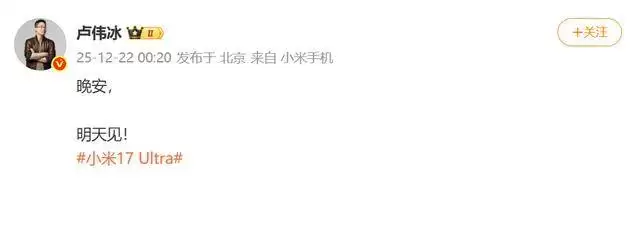 在发布会正式官宣前,小米集团合伙人、总裁,手机部总裁,小米品牌总经理卢伟冰于 22 日凌晨在社交平台发文“明天见!”,并带上“小米 17 Ultra”话题,这一举动瞬间点燃了网友的热情,大家纷纷猜测小米是否要为新机开启预热活动。