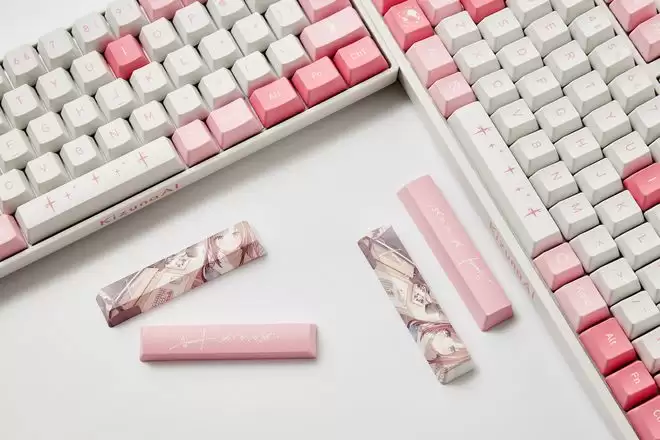 这两款键盘采用了绊爱主题的粉白配色方案,并配备了原厂高度 PBT 材质五面热升华工艺键帽,还随附了绊爱特别版空格键替换键帽。
