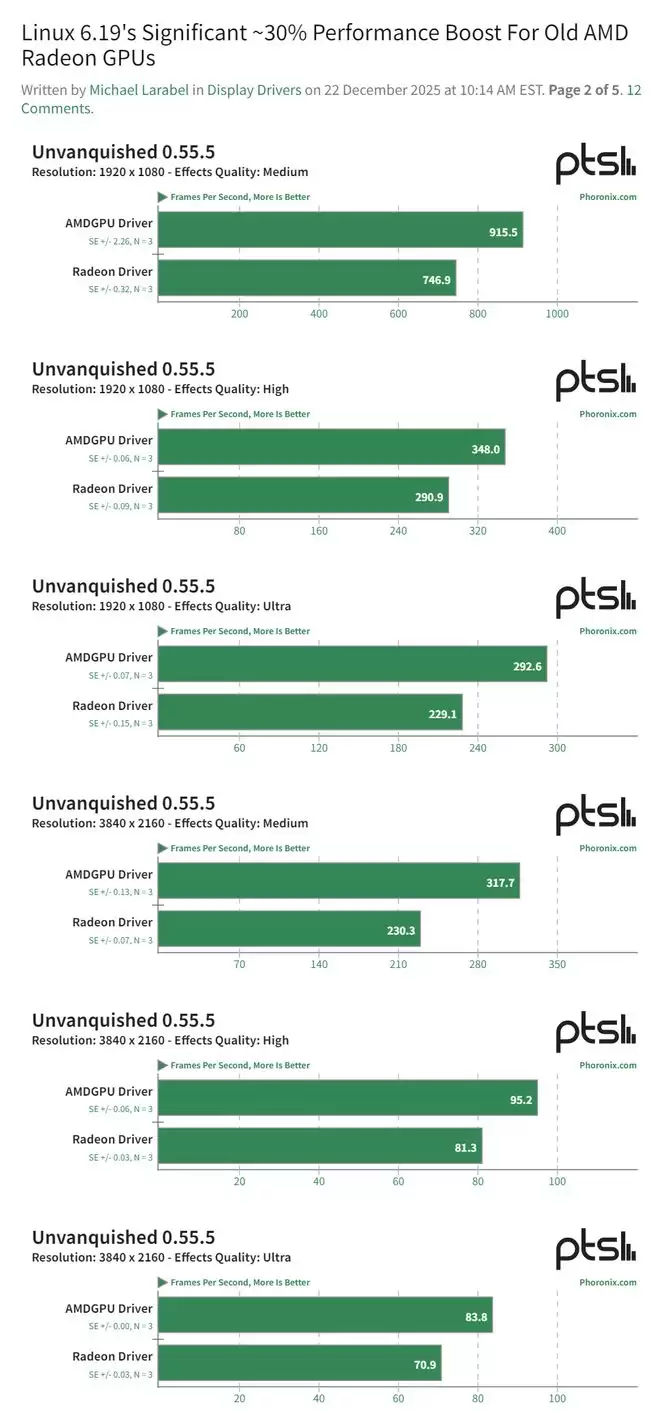 此次驱动变更预计将带来明显的性能提升。根据海外媒体的测试数据,在Linux 6.19内核下,老款AMD Radeon显卡的性能提升了约30%。