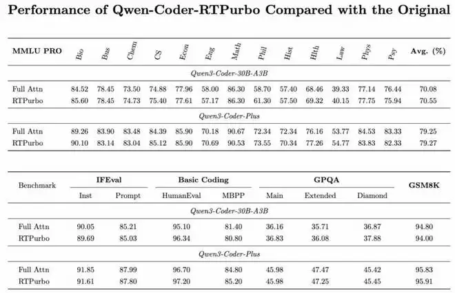 在长文本测试场景下,RTPurbo 仅保留约 15% 的 Attention Heads 使用 Full KV cache,压缩后的 Qwen-Coder-Plus、Qwen3-30B-A3B-Instruct 在多项长文指标上可与未压缩模型齐平,充分验证了压缩后模型的精度保障。