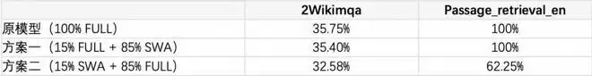 方案一:只有 15% 的长程头使用 Full Attention,剩余 85% 使用 SWA;方案二:15% 的长程头使用 SWA,剩余 85% 使用 Full Attention。